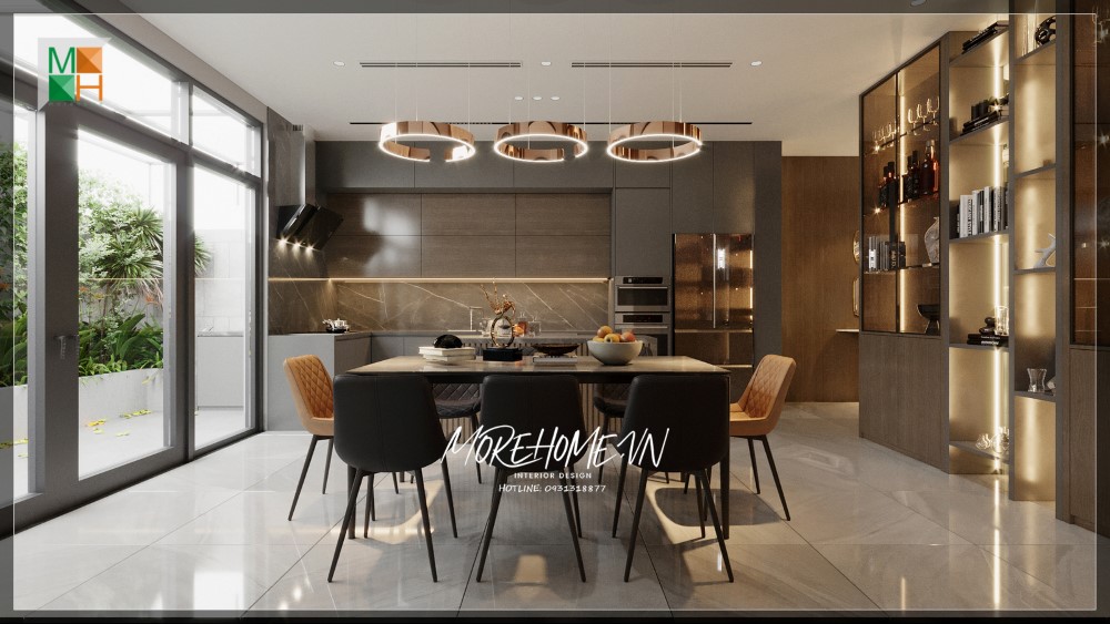. Tủ bếp gỗ công nghiệp hiện đại, cùng với mặt bếp ốp đá màu đen cao cấp, sẽ giúp không gian bếp trở nên sạch sẽ và tiện nghi hơn cho người nội trợ.